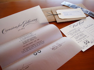 What a great touch to these already stunning invitations. "The polished presence of your sincere self and guest of favor" to celebrate with "libations, and victuals"