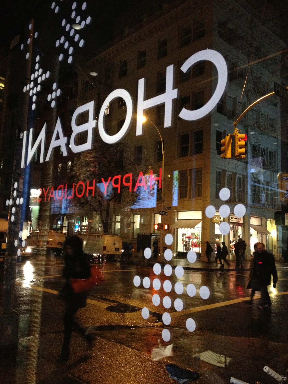 Now that I am getting cozy in my new home in the world of yummy treats, I have been lucky to spend some time with very sweet elves at the CHOBANI SOHO Cafe. They have been working away making installations and hanging holiday greetings. The vibe in and around that Cafe is so wonderful as well. The street corner has been transformed to a nice meeting spot for friendly neighbors and visitors alike.